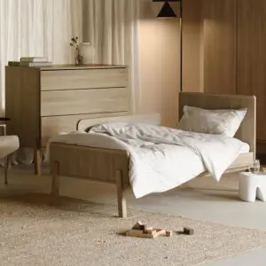 Kyo beds evolve with your child, from a compact 120 x 70 cm cot to an extended version using the Junior Kit. Clean lines and careful craftsmanship bring calm and durability into the nursery.