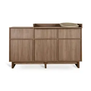 Die XL-Version bietet drei Schubladen und drei Push-to-Open-Türen für großzügigen Stauraum und ist kompatibel mit der XL-Erweiterung und dem Wickelaufsatz. Das optionale Regalmodul ergänzt zusätzlichen Stauraum und architektonische Präsenz.