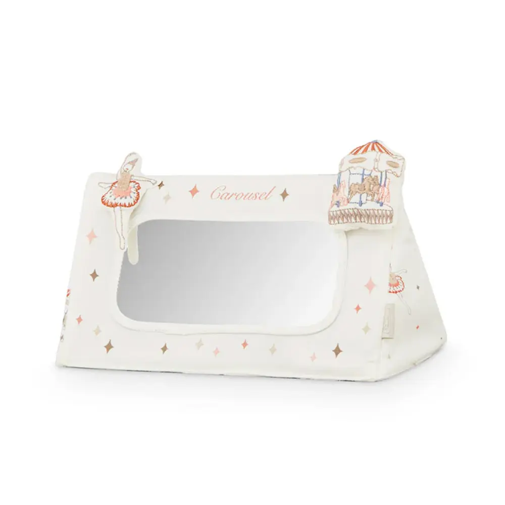 Dieser weiche Bauchlage-Spiegel ist vom Charme eines nostalgischen Karussells inspiriert und wurde für die ersten Spielmomente entwickelt. Verspielte Applikationen wie eine Ballerina und ein Karussell-Motiv laden zum Entdecken ein. Knisterelemente und ein integrierter Quietscher sorgen für sensorische Reize und fördern das Greifen. Durch seine handliche Form eignet er sich ideal für das Spielen auf dem Boden.