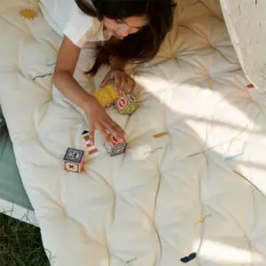 Weiche Spielmatratze von Dear April (90×120 cm) mit besticktem Canvas-Bezug. Komfortabel, langlebig und skandinavisch elegant.