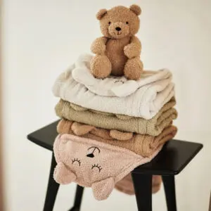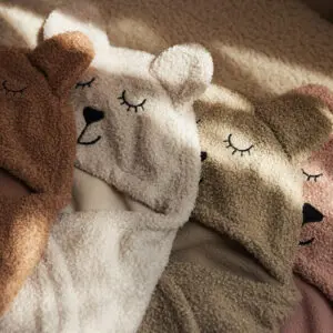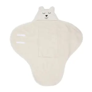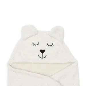 Flauschige Einschlagdecke mit Kapuze und Bärenohren. Hält dein Baby warm und geborgen – perfekt für Zuhause und unterwegs.