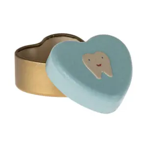 Die kleine Maileg Aufbewahrungsbox im Metallherz-Design ist perfekt, um Milchzähne sicher zu verwahren. Mit Zahnprägung und Crackled-Oberfläche bleibt sie ein einzigartiges Erinnerungsstück.