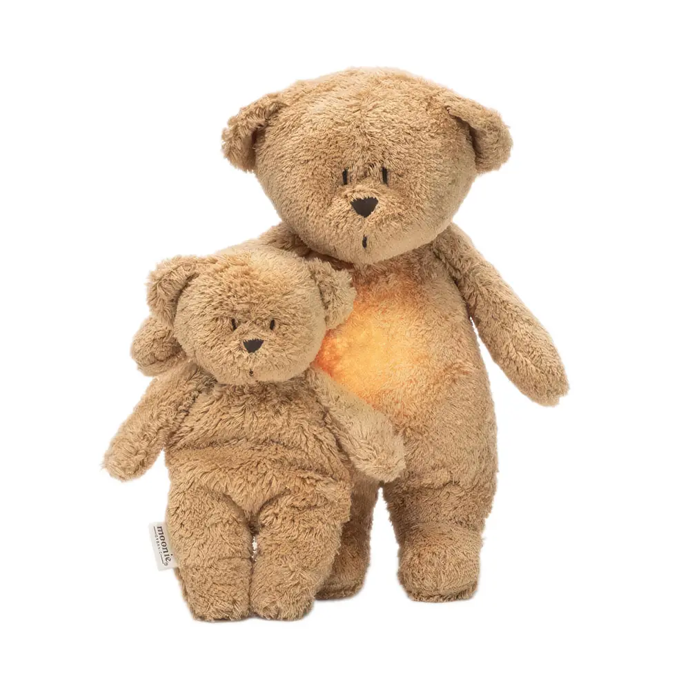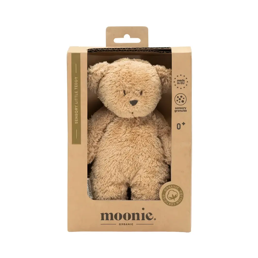 Moonie – Sensory Little Teddy – Cappuccino ist ein weiches Mini-Kuscheltier aus GOTS-zertifizierter Bio-Baumwolle. Im Bäuchlein befinden sich feine sensorische Kügelchen, die sich angenehm anfühlen und Tastsinn sowie Feinmotorik unterstützen.