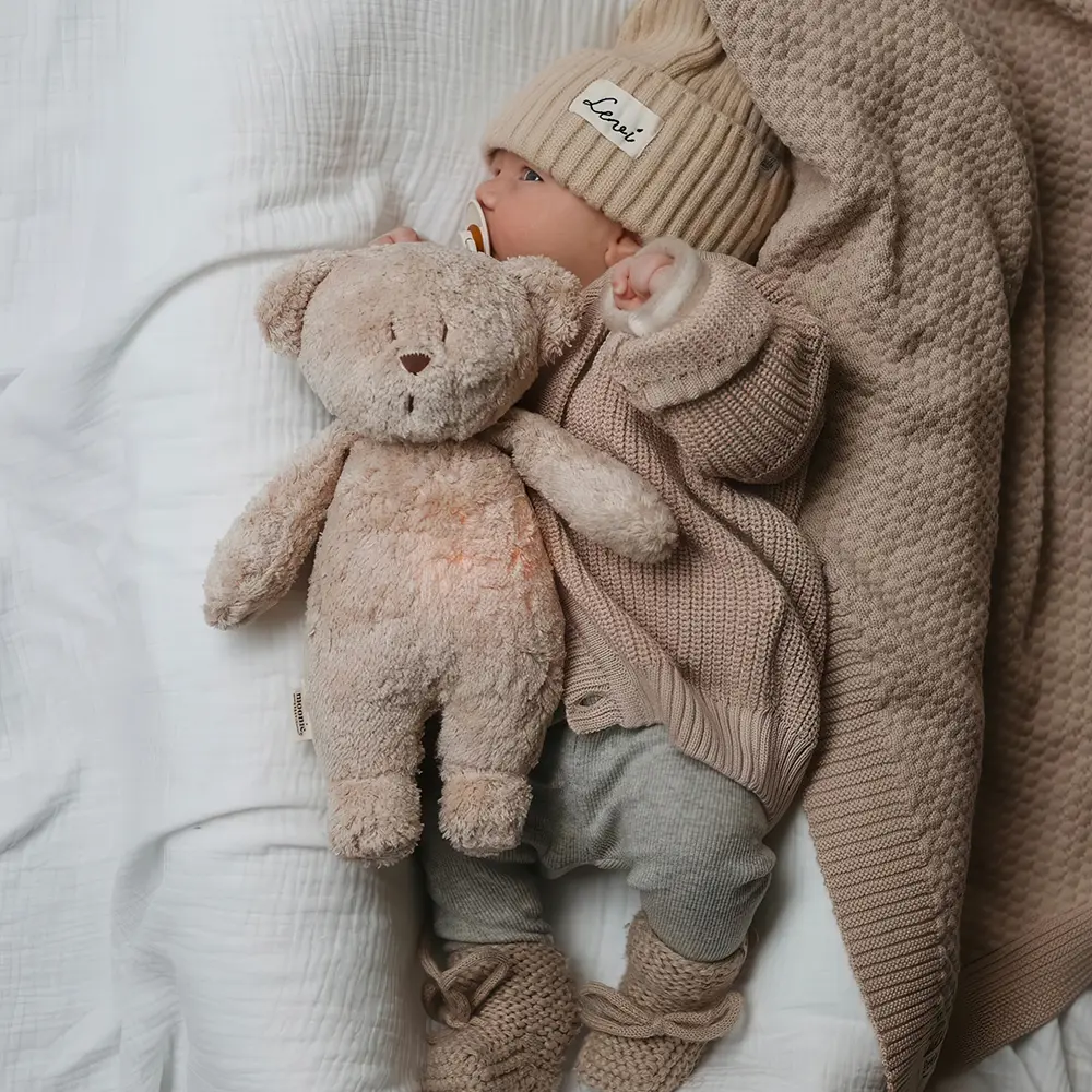 Sanftes Kuscheltier aus Bio-Baumwolle mit Naturklängen, Schlafliedern, Aufnahmefunktion und Nachtlicht in 7 Farben. USB‑C aufladbar mit Cry Detector.