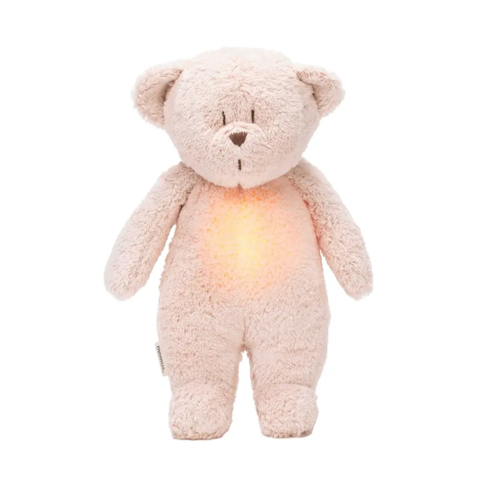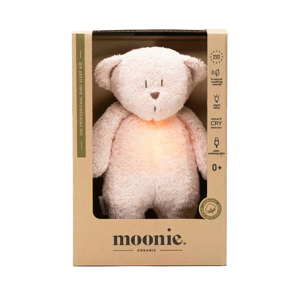 Moonie – The Humming Bear – Rose 2.0 unterstützt beim Einschlafen mit entspannenden Naturklängen, leisen Schlafliedern und einem sicheren Nachtlicht. Erkennt das Weinen, startet das ausgewählte Setting automatisch neu und spendet sofort Trost.