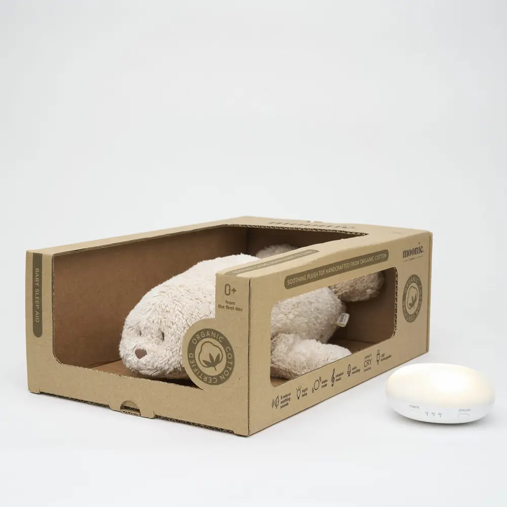 MOONIE Der summende Seehund Sand 2.0 unterstützt ein entspanntes Einschlafritual mit 5 natürlichen Geräuschen (Gebärmutter, Wind, Waldbach, Regen und Wellen) sowie 3 sanften klassischen Wiegenliedern. Die Klänge basieren auf echten Aufnahmen und wirken dadurch besonders natürlich.