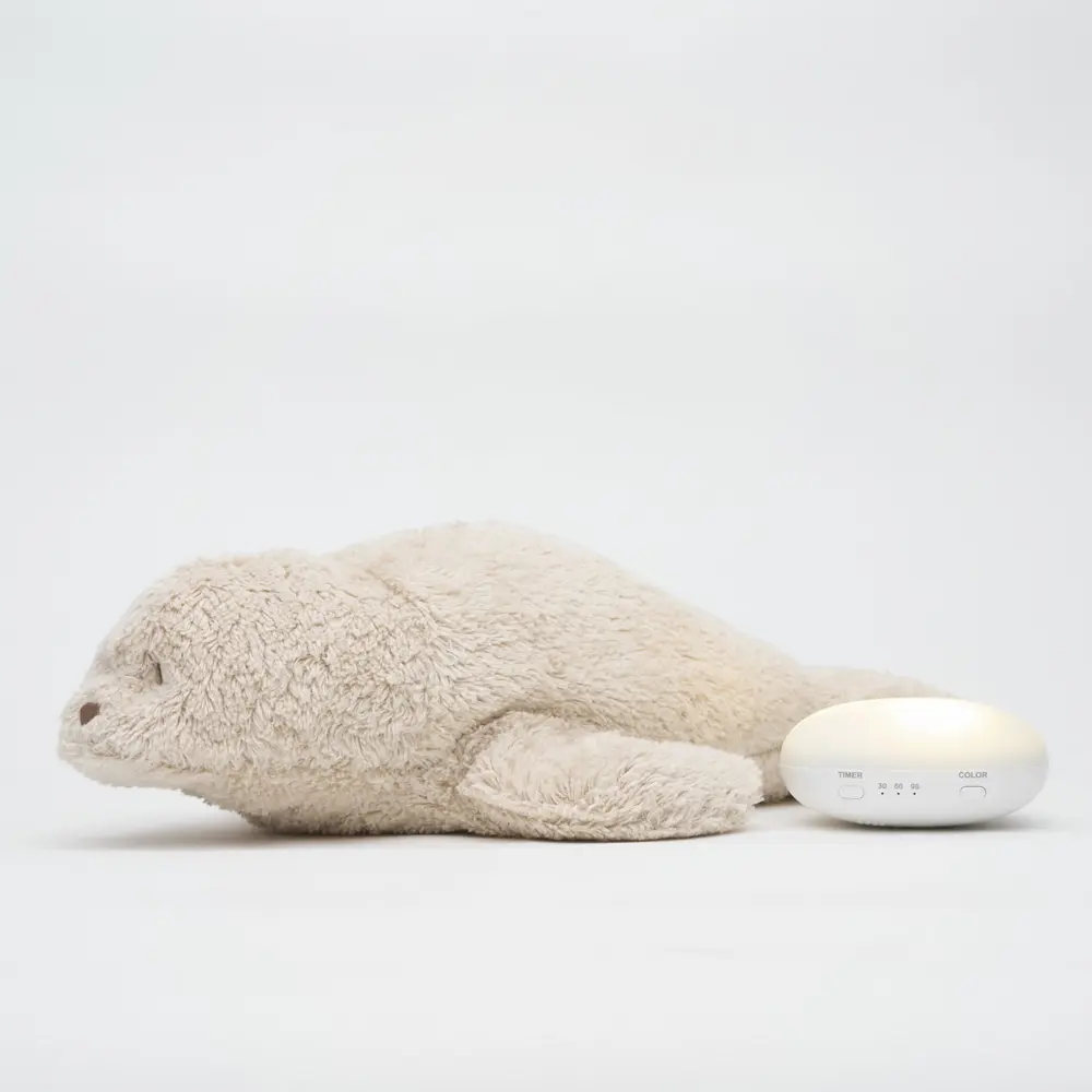 Weicher Seehund aus Bio-Baumwolle mit Naturklängen, klassischen Schlafliedern und sicherem, kühlem Nachtlicht. Mit Smart Cry Detector, Sprachaufnahme, Schüttelmodus und USB‑C‑Lademodul.