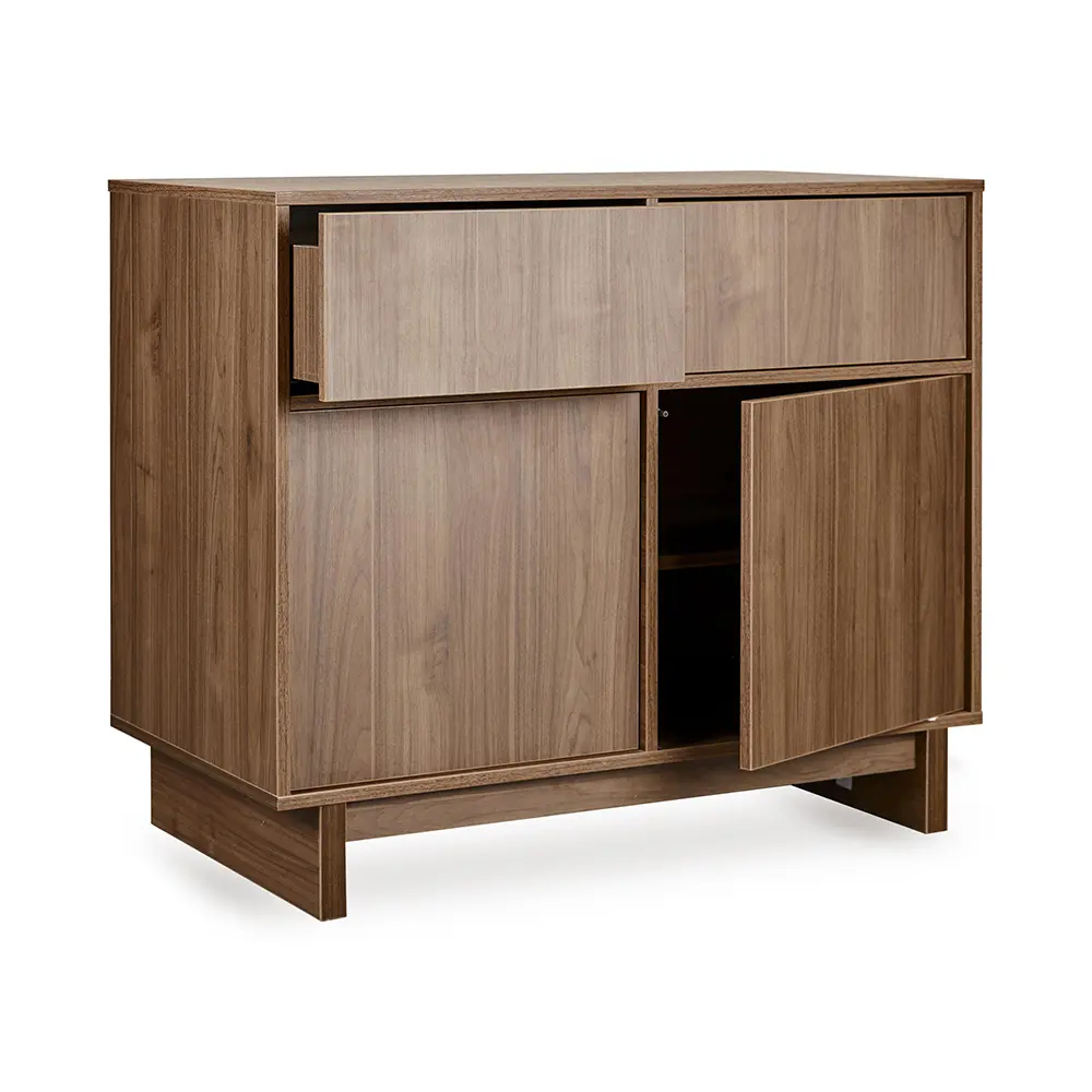 Die Kyo-Kommode verfügt über zwei Türen und zwei Push-to-Open-Schubladen, die für übersichtliche Ordnung sorgen. Dank ihres warmen, minimalistischen Designs passt sie in jedes Kinderzimmer. Mit dem optionalen Wickelaufsatz wird sie im Handumdrehen zur großzügigen Wickelkommode.