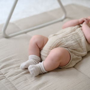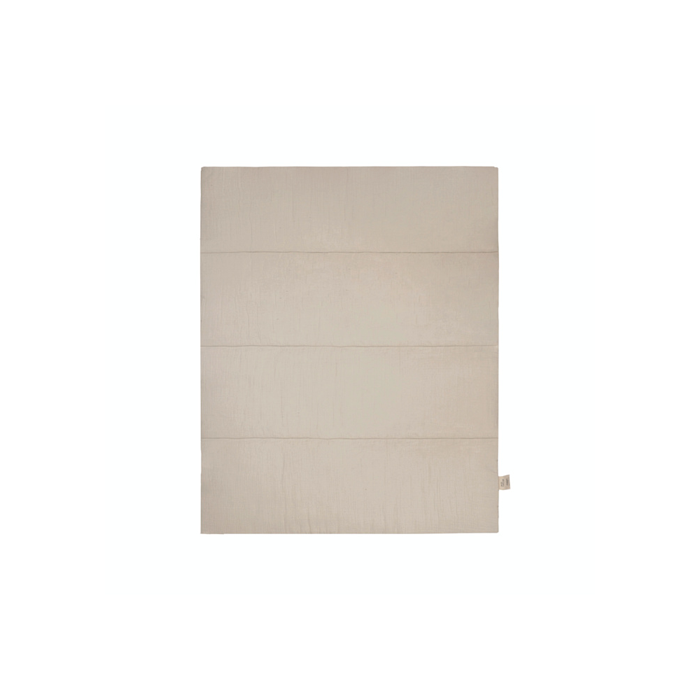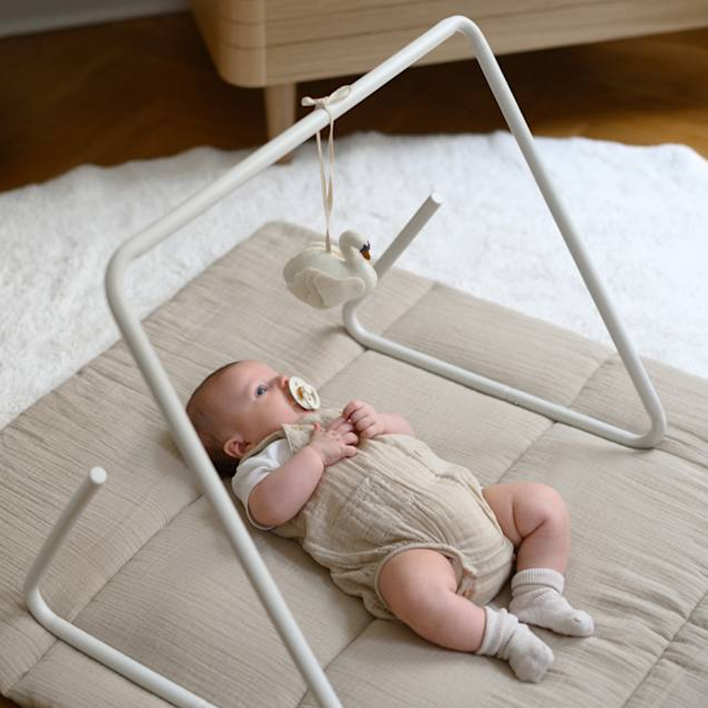 Die gepolsterte Struktur schafft eine weichere Unterlage als der Boden und unterstützt den Alltag mit Baby. Musselin fühlt sich atmungsaktiv an und bleibt auch bei längerer Nutzung angenehm. Die Matte lässt sich leicht von Raum zu Raum tragen und eignet sich gut unter einem Spielbogen. Eine praktische Lösung für Komfort ohne viel Aufwand.