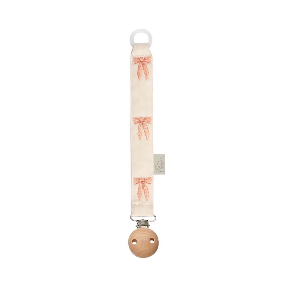 Deze geborduurde speenkoord houdt de speen altijd dichtbij en van de grond. De stof is gemaakt van biologisch katoen en afgewerkt met fijne strikborduursels. De houten clip met nikkelvrije sluiting bevestigt stevig aan kleding. De flexibele ring past op de meeste spenen. Ontworpen voor dagelijks gebruik.