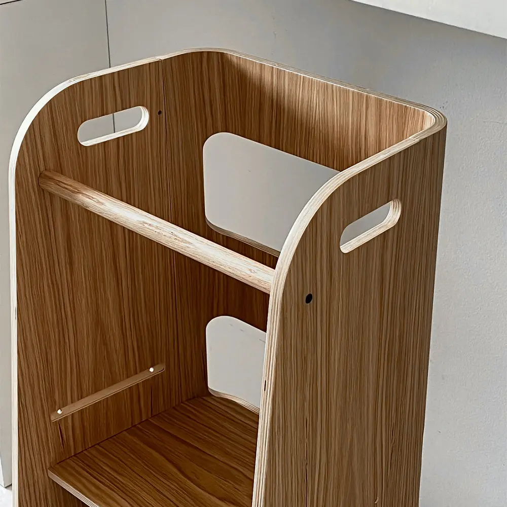 De leertoren van Curve Lab combineert Noords design met Montessori-principes en biedt een veilige, functionele en stijlvolle manier voor kinderen om hun omgeving te verkennen. Het past perfect tegen keukenbladen en laat kinderen meedoen aan dagelijkse activiteiten, terwijl het zelfstandigheid en zelfvertrouwen bevordert. Het open frame maakt het eenvoudig voor kinderen om zelfstandig in en uit te klimmen, wat coördinatie en zelfredzaamheid stimuleert.