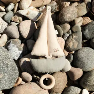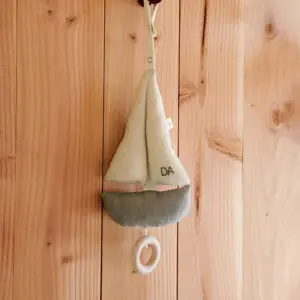 Charmante muziekmobiel van Dear April (22 cm) met zeilbootontwerp in blauw/wit. Speelt een rustgevende melodie en siert elke babykamer.