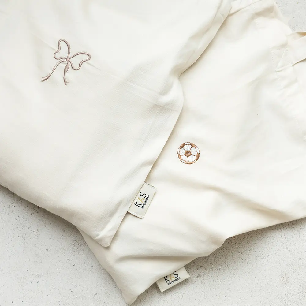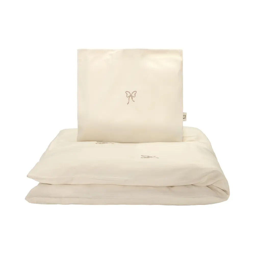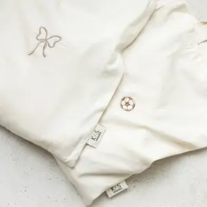 Zacht baby beddengoed van biologische satijnkatoen met fijne geborduurde strikken. Ademend, stijlvol en zacht voor de allerkleinsten.
