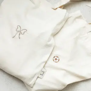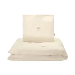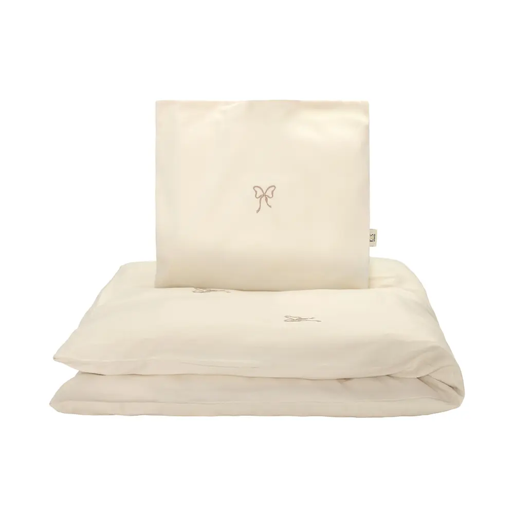 Zijdezacht junior beddengoed van biologische satijnkatoen met een verfijnd geborduurd strikmotief. Tijdloos, elegant en heerlijk comfortabel.