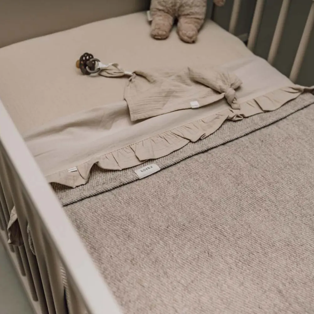 Zachte ledikantdeken uit de Toronto-collectie van Koeka in de kleur sand. Ontworpen voor dagelijks gebruik met een rustige uitstraling en materialen die fijn aanvoelen voor ouder en baby.