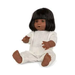 Pop met vinylhaar, kleding van bio-katoen & drinkflesje. Harriet kan drinken en plassen. Vanaf 3 jaar. Afmeting: H 42 × B 20,5 × D 10,5 cm.