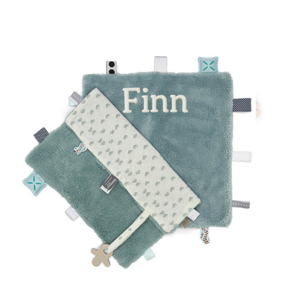 De zachte stofjes en herkenbare labeltjes geven comfort, rust en stimuleren tegelijkertijd de tastzin en fijne motoriek.