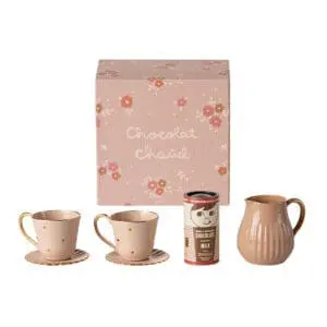 Deze mini warme chocolademelk set bestaat uit kopjes, bordjes, een kannetje en chocolade. Perfect voor de Teddy-familie én voor konijnen en hazen.