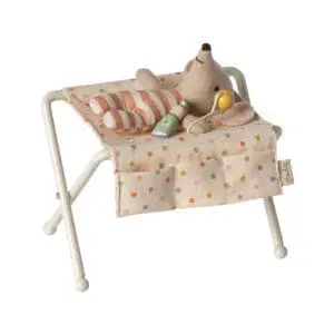 Deze commode is voorzien van alles wat je nodig hebt voor de verzorging van baby’s, inclusief zijvakjes, een rammelaar en babylotion.