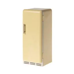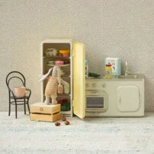 Een metalen koelkast in vintagestijl met matte plankjes en een magnetische deur. Hij past perfect in het miniatuurhuis en kan worden aangevuld met een miniatuur boodschappenmandje.