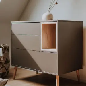Met de Cocoon Collectie creëert u een babykamer die uw unieke stijl weerspiegelt. Dit Europese design transformeert commodes en kasten in persoonlijke pronkstukken dankzij de verwisselbare nis-kleuren. Kies uit aardse tinten of gedurfde accenten voor uw eigen rustgevende oase. De mix van modern ontwerp en aanpasbare details brengt stijlvol ‘cocooning’ tot leven, gemaakt voor comfort, gecreëerd door u.