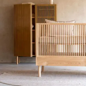 Dit elegante Quax Hai No Ki babybed (140 x 70 cm) is vervaardigd uit massief essenhout en essenhoutfineer. Het bed is in hoogte verstelbaar en kan met behulp van optionele accessoires eenvoudig worden omgebouwd tot een peuterbed of juniorbed.