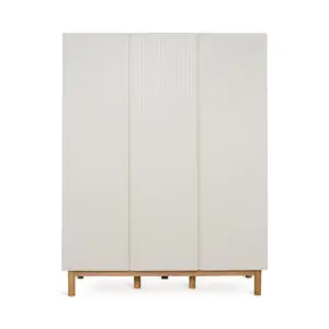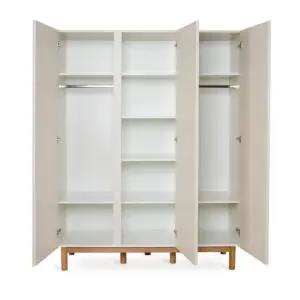 Deze grote kledingkast van Quax Mood heeft drie deuren, acht legplanken en drie kledingroedes. Dankzij het moderne push-to-open systeem en de stevige beukenhouten poten combineert deze XL kledingkast functionaliteit, duurzaamheid en tijdloze elegantie.