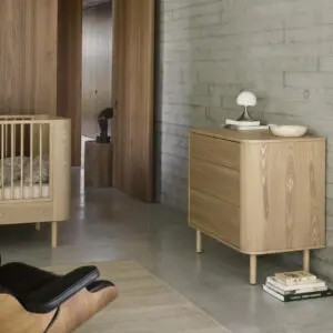 De Yume Commode met Laden voegt tijdloze elegantie en praktische opbergruimte toe aan elke babykamer. Gemaakt van massief essenhout en fineer, bevat het drie ruime lades en kan het worden omgebouwd tot een commode met de optionele XL-uitbreiding.