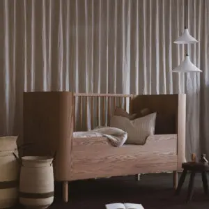 Het Yume Bed is een tijdloos babybed gemaakt van massief essenhout. Het heeft twee instelmogelijkheden voor de matrashoogte en kan worden omgezet in een juniorbed. Afmetingen: 140 x 70 cm.