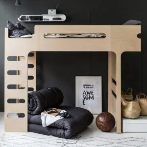 Dit bed is gemaakt om het échte gezinsleven aan te kunnen. Afgewerkt met hoogwaardig laminaat is het oppervlak bestand tegen krassen, vlekken en slijtage — dus je hoeft je geen zorgen te maken over vieze handjes, omgevallen drinken of ongelukjes met stiften. Met een snelle veeg is het weer schoon. Onder het strakke design schuilt sterk Fins berkenmultiplex — waardoor het bed stevig blijft en het moderne uiterlijk elke kinderkamer opfleurt. Dit bed is gemaakt om jarenlang mee te gaan: om op te klimmen, in te ontspannen en in op te groeien. Profiteer van de volgende voordelen Meer speelruimte –…