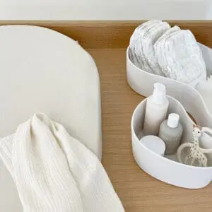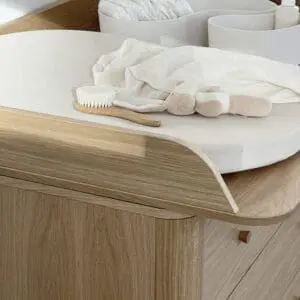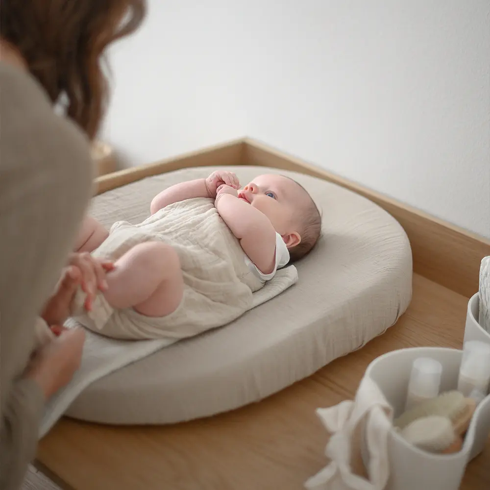 Dit zachte, ovale verschoonkussen met hoge rand heeft een wasbare, gecoate hoes van biologisch katoen. Het combineert comfort, veiligheid en stijl.