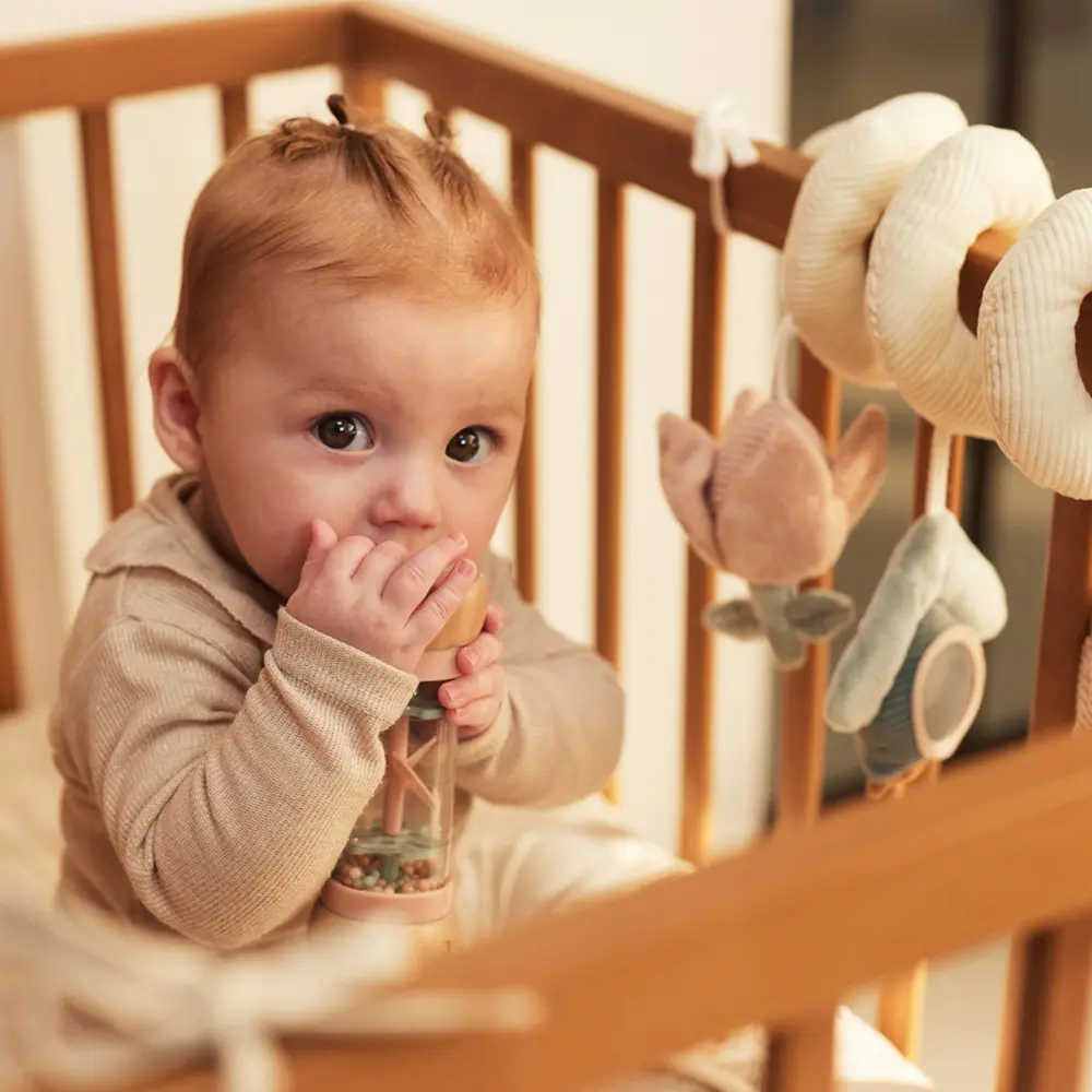 This rain rattle makes playtime more engaging by combining movement, colour and sound. The falling beads immediately catch your baby’s attention and encourage them to keep watching and listening. That is not only fun, but also helps stimulate the senses in a playful way. It is exactly the kind of toy curious babies want to explore again and again.