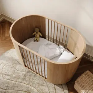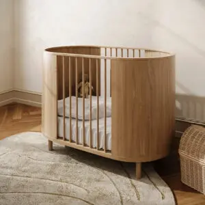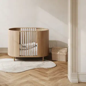 The frame is made from solid oak – known for its strength, longevity, and rich natural tone. Each piece highlights the unique grain of the wood, making every cot one of a kind. Oak is not only visually warm and calming, but also highly resistant to wear – a sustainable choice for design-conscious parents.