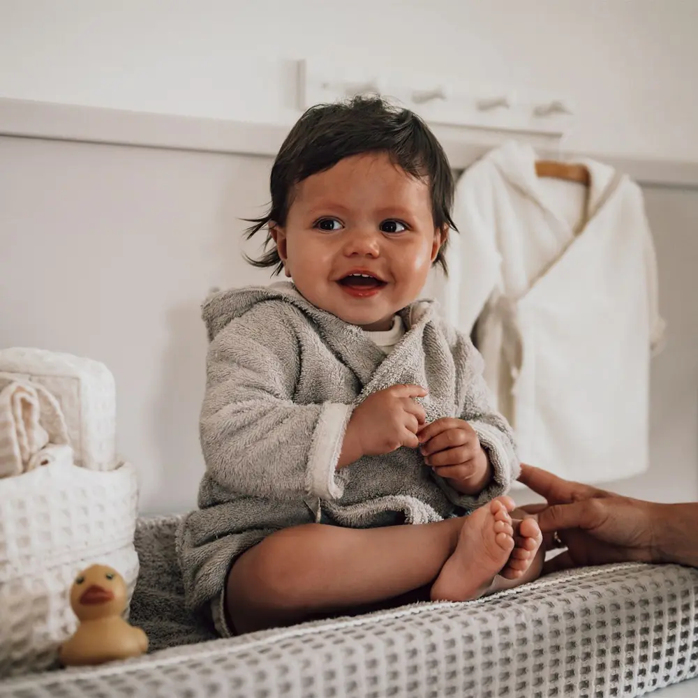 The practical shape makes this baby bathrobe easy to use every day, from quiet moments at home to trips on the go. The breathable materials help to keep your child comfortable while you stay organised. Because of the timeless design, the item can be used for a long time and passed on within the family.