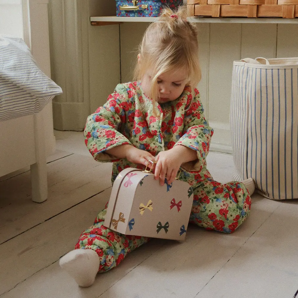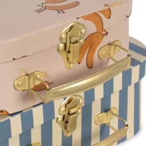 Set of two cardboard play suitcases with metal handle – the small fits into the large.