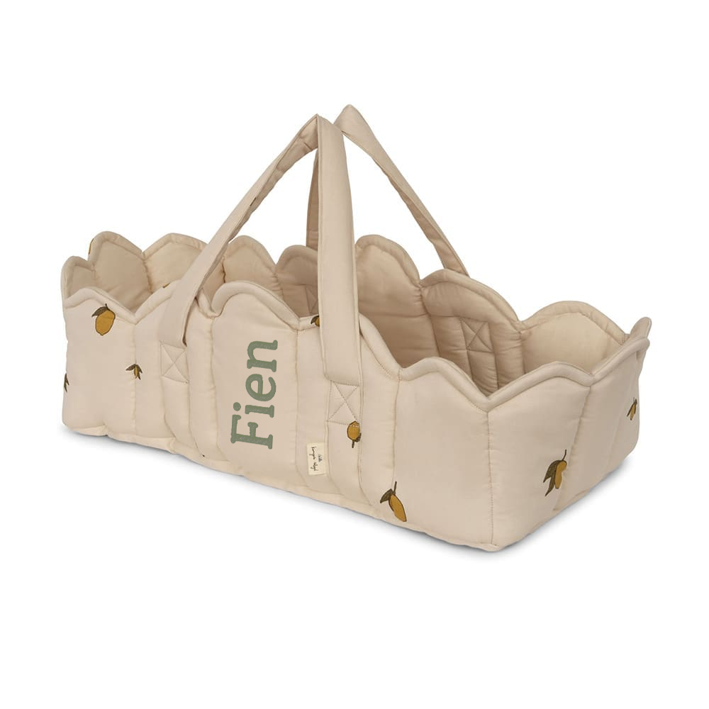 Padded doll carrycot made of 100% cotton with practical straps, soft piping and scalloped edges. This product is customizable with your child’s name, beautifully embroidered.
