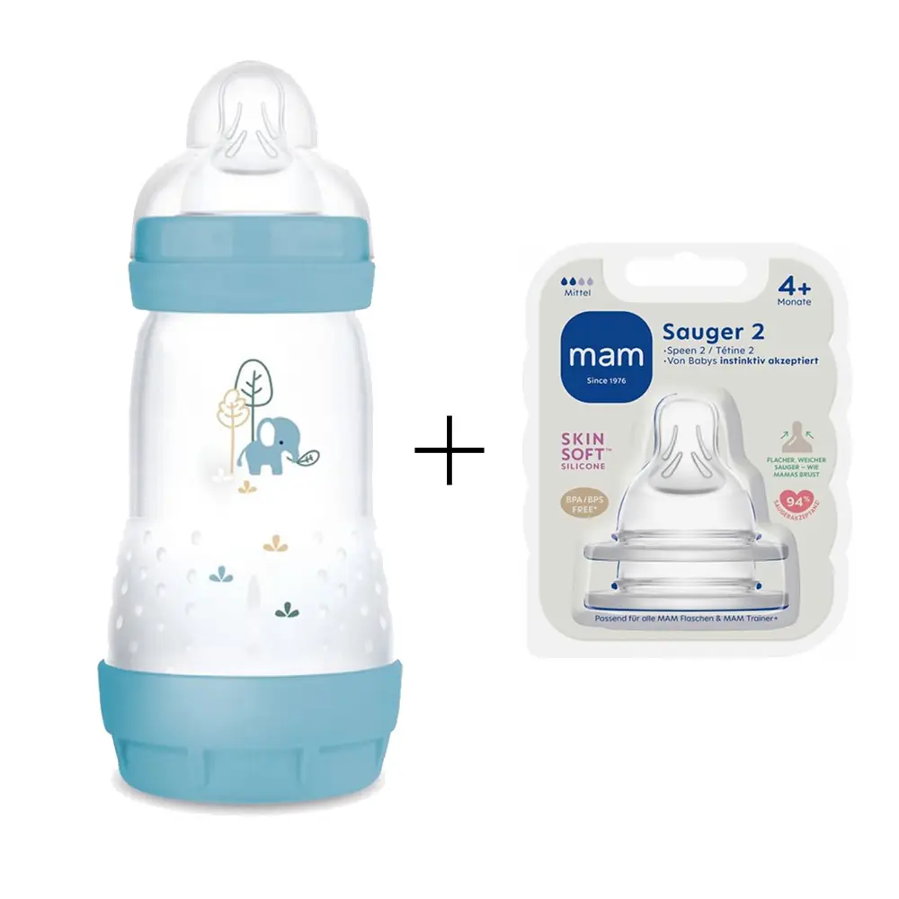 The MAM Easy Start Anti-Colic Elements Bottle (260 ml) in Blue comes with a SkinSoft™ silicone teat size 2 for medium flow. Anti-colic vented base, self-sterilizing function, and BPA-free design for babies from 2+ months.