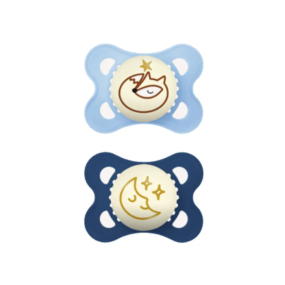 Shop the MAM Pure Night Silicone Pacifier – Set of 2 in all sizes now at Akomo Kids – designed for peaceful nights and growing smiles!
