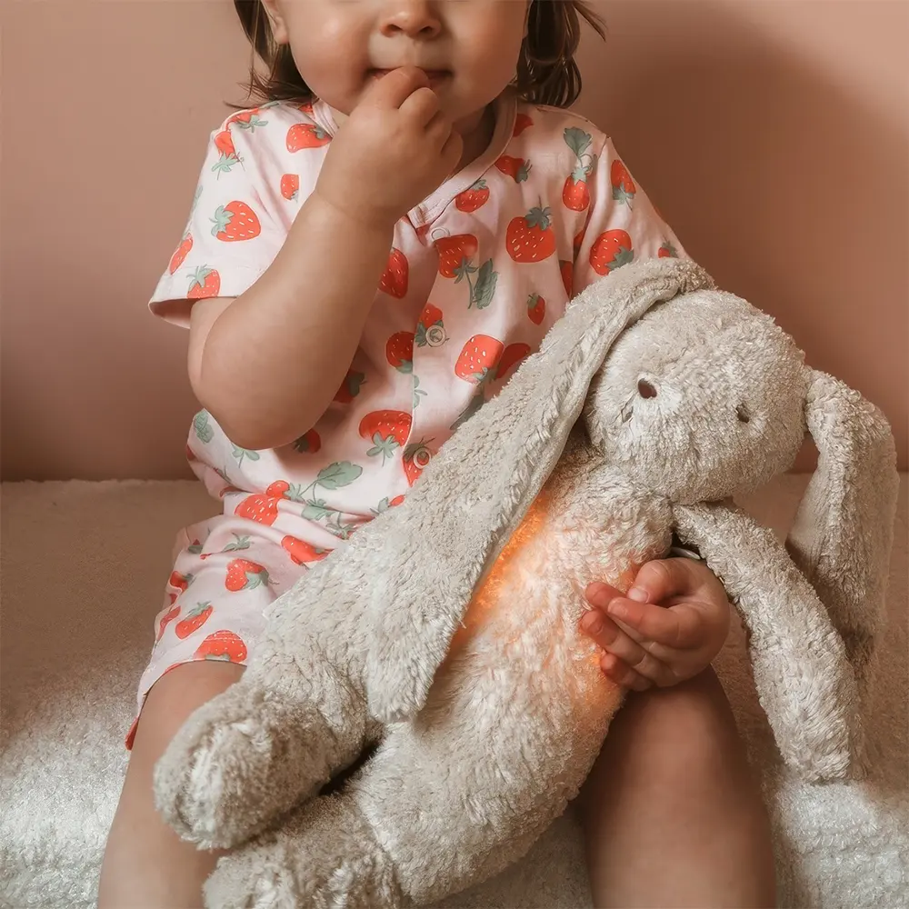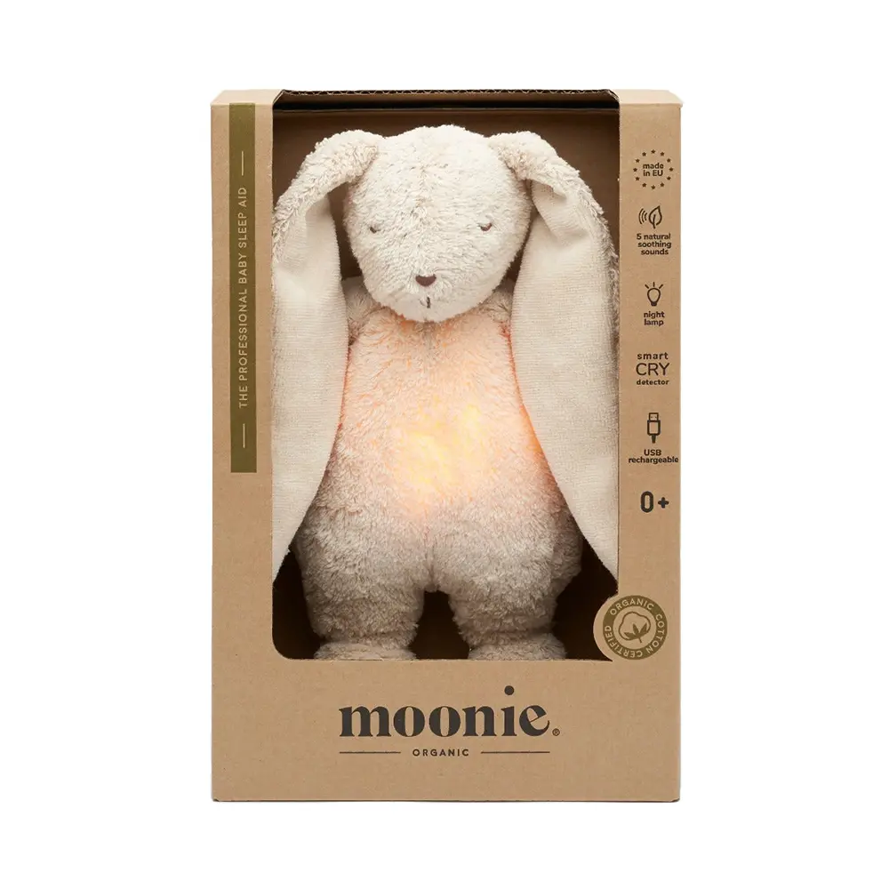 Moonie – The Humming Bunny – Sand 2.0 helps your little one settle with soothing nature sounds, soft lullabies and a warm, safe night light. The sound restarts automatically when crying is detected, so comfort is close – even at night.
