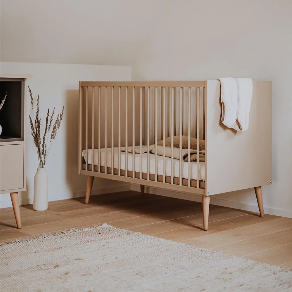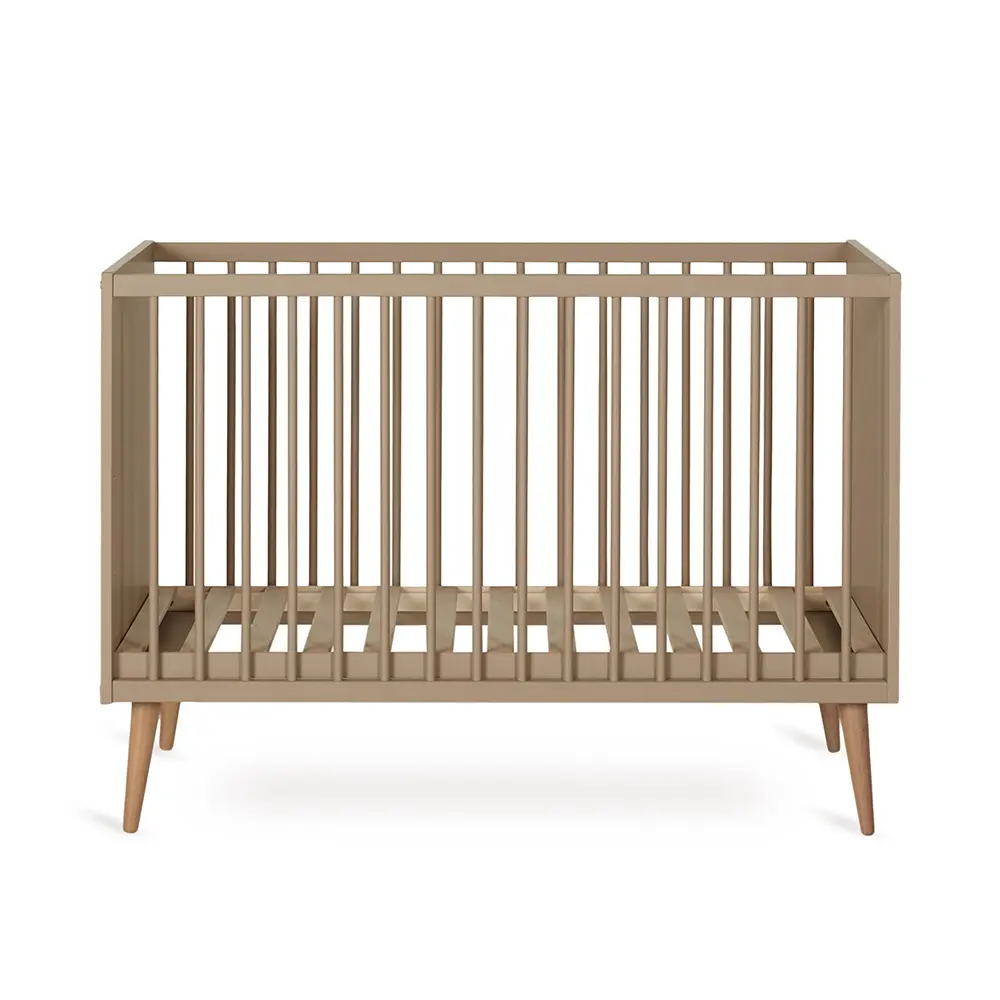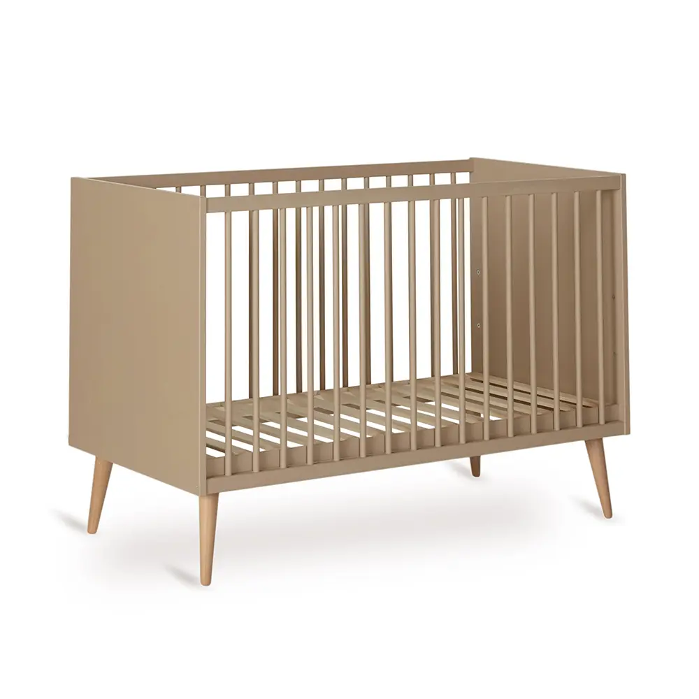 The Cocoon Baby Cot provides a safe and stylish sleeping space that can be adapted to your needs thanks to its three-position adjustable base. Its solid beech feet add natural warmth, and the cot meets safety standards to give you complete peace of mind. Designed as part of the Cocoon Collection, it combines minimalist design with personal expression to bring calm and character to your dream nursery.