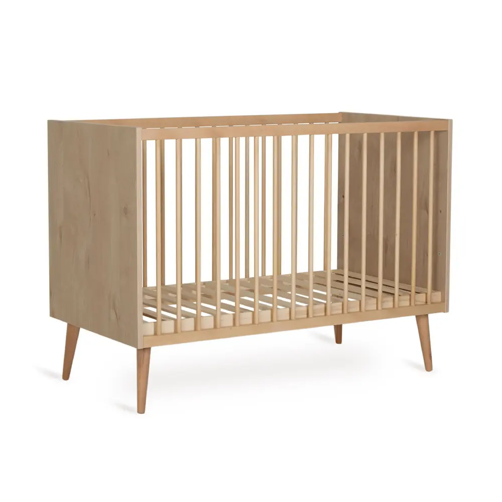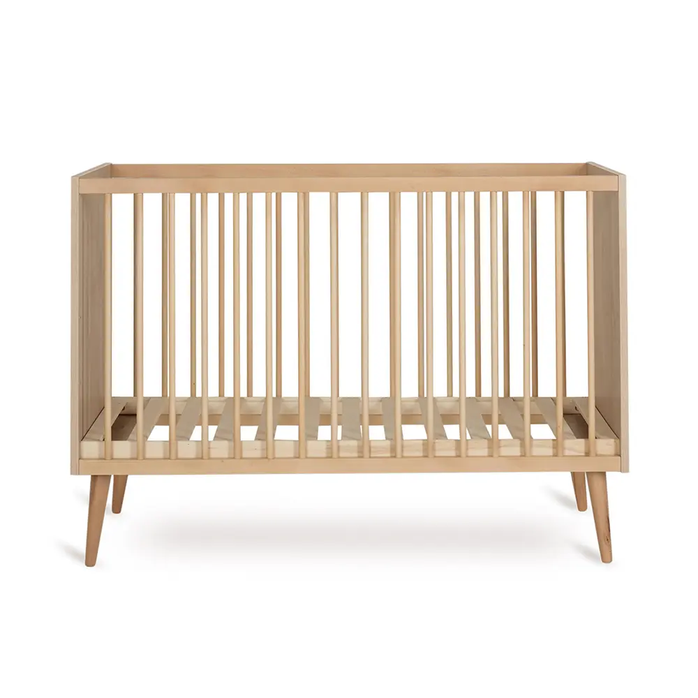 The Cocoon Baby Cot provides a safe and stylish sleeping space that can be adapted to your needs thanks to its three-position adjustable base. Its solid beech feet add natural warmth, and the cot meets safety standards to give you complete peace of mind. Designed as part of the Cocoon Collection, it combines minimalist design with personal expression to bring calm and character to your dream nursery.