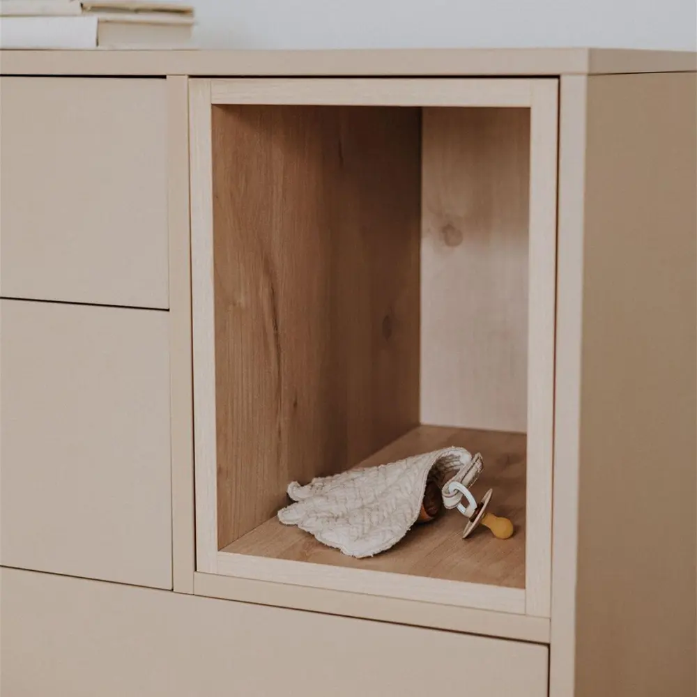 Transform your Cocoon Commode into a practical changing table with the Cocoon Commode Extension. The recessed tray has a raised edge of 12 cm to ensure comfort and safety during nappy changes, and the surface measures 50 x 70 cm to offer generous space. Crafted from FSC-certified wood and compliant with safety standards, it is both durable and safe. When you no longer need it, simply remove the extension to keep your nursery flexible and beautifully arranged.