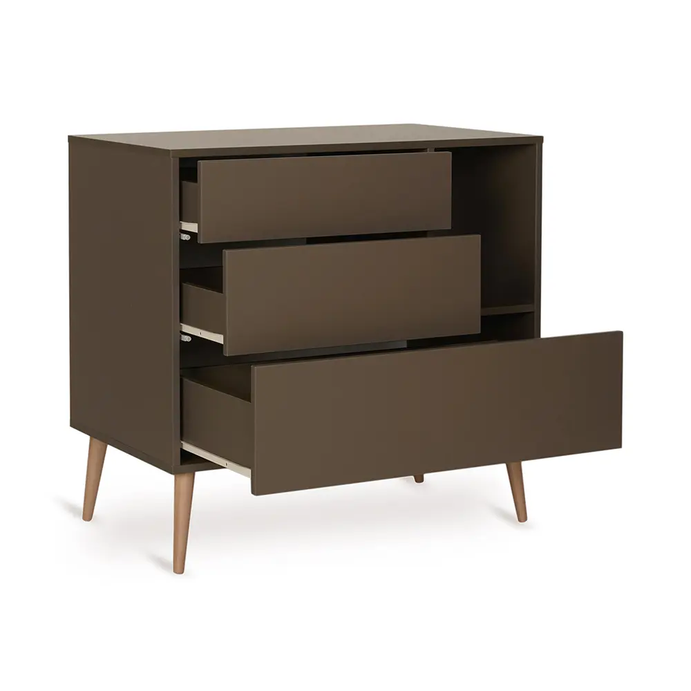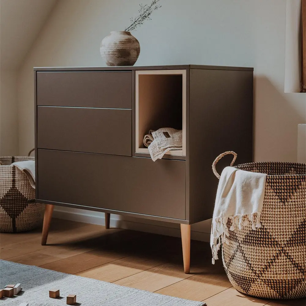 The Cocoon Chest boasts push-to-open drawers and customisable colour niches, allowing you to create a personalised look. An optional extension creates a changing table, combining modern style with practical storage to help you keep your nursery beautifully organised.