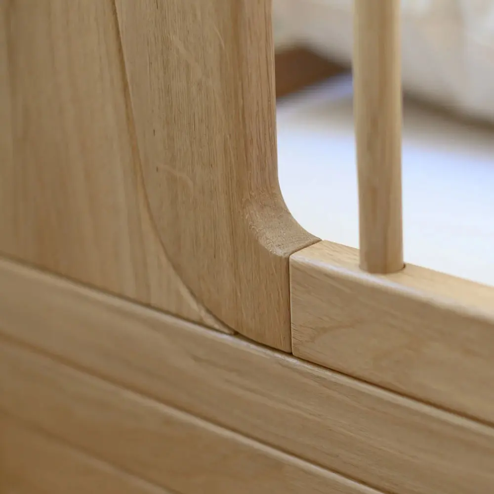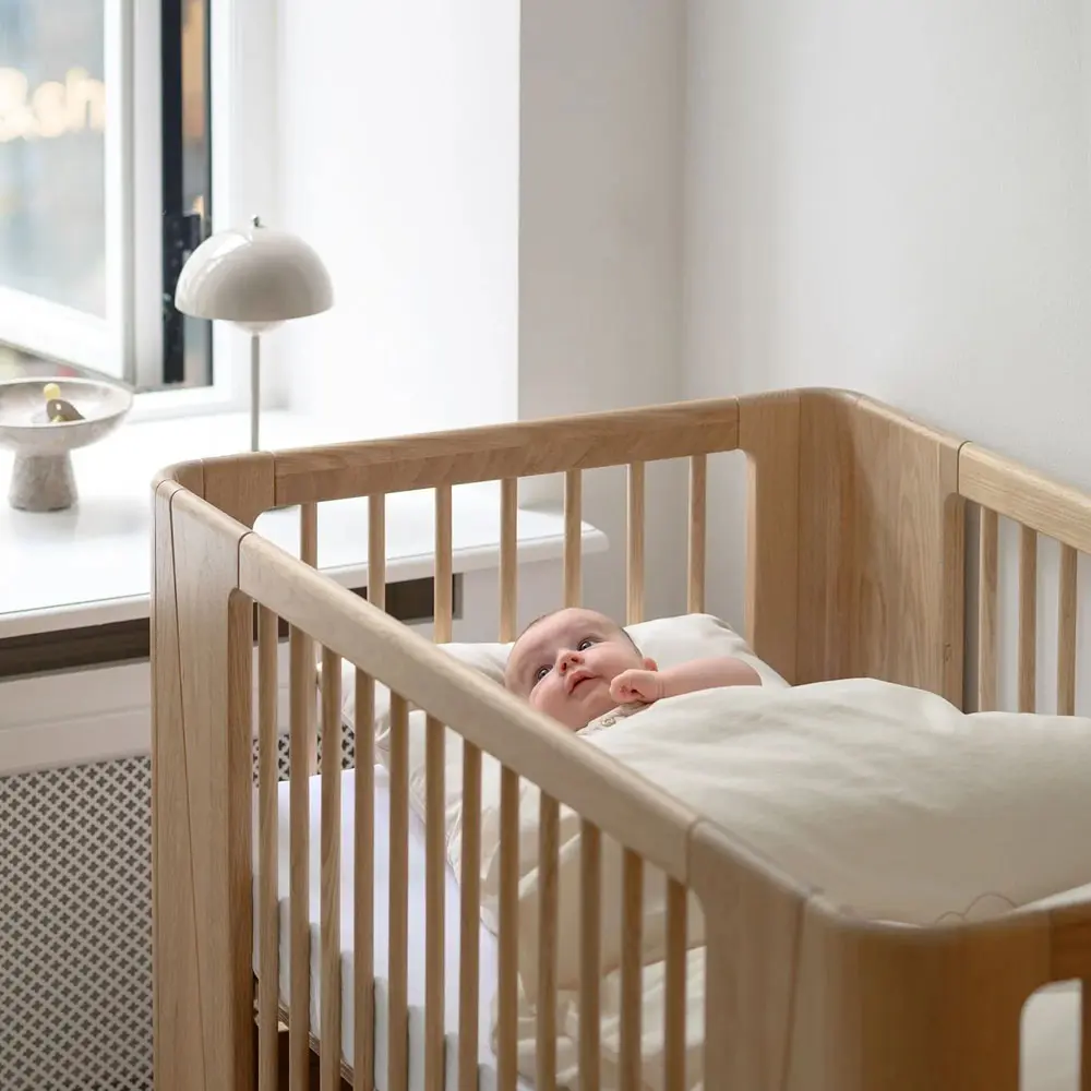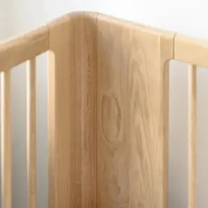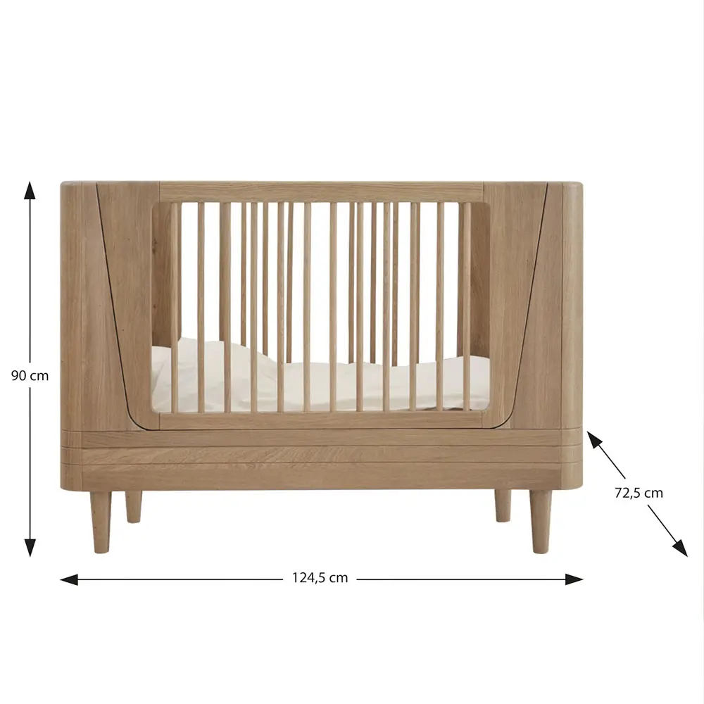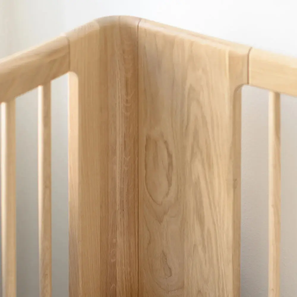 A timeless baby bed crafted from solid oak, refined with a design free of visible screws. It grows effortlessly with your child and transforms into a junior bed with a conversion kit – safe, durable, and made to last for years.